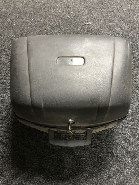 A box of Commodore 64, PC surround sound speakers, motor bike box with key etc
