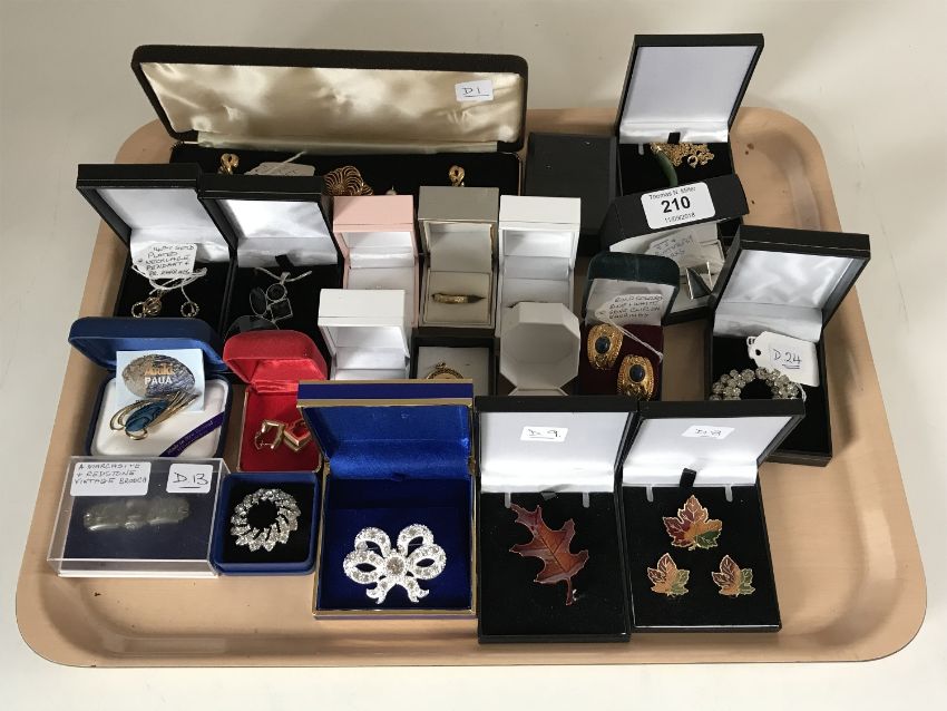 A tray of various costume jewellery, brooches, earring and necklace set, dress rings etc (Q)