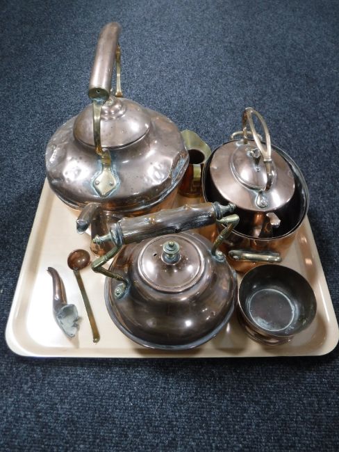 A tray of antique copper ware, three kettles, small jug, twin handled cooking pot with liner etc