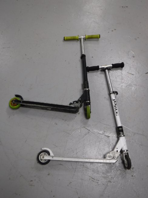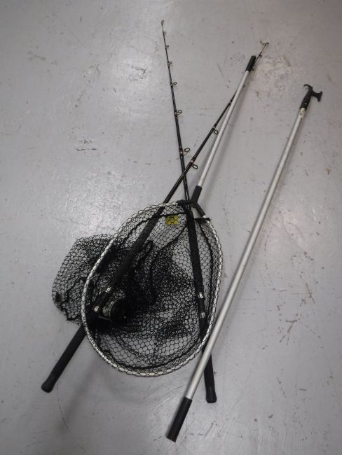 Two boat fishing rods, reel, landing net, fish and boat hook, two child's scooters and a fish prep knife set