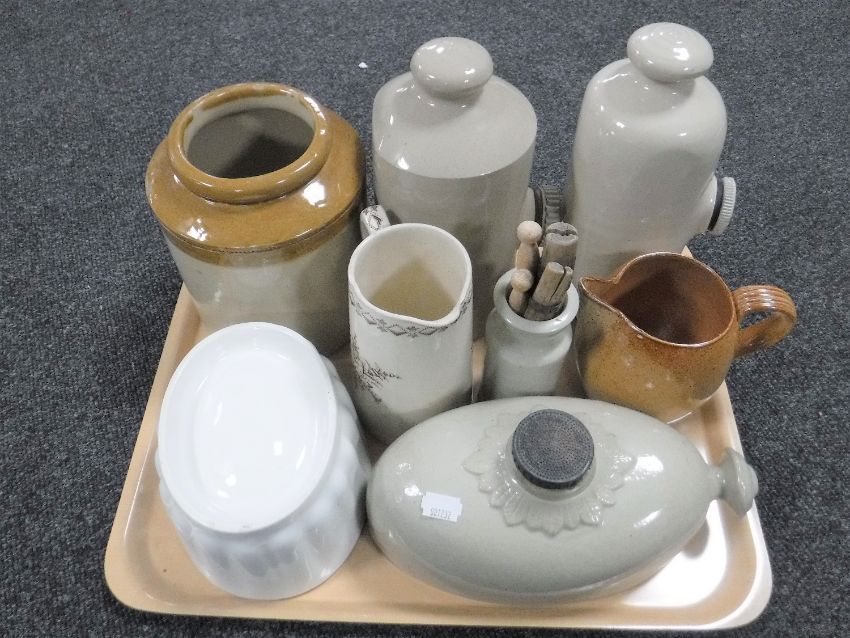 A tray of three antique stoneware hot water bottles, glazed pottery brush pot, china jelly mould, Doulton stoneware jug etc