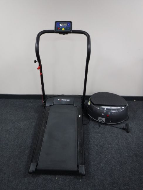 A Confidence Fitness electric treadmill and a Vibra Power disc vibration plate