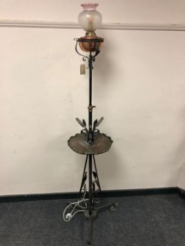 An Arts and Crafts copper and wrought metal standard lamp with etched glass shade, height 169cm