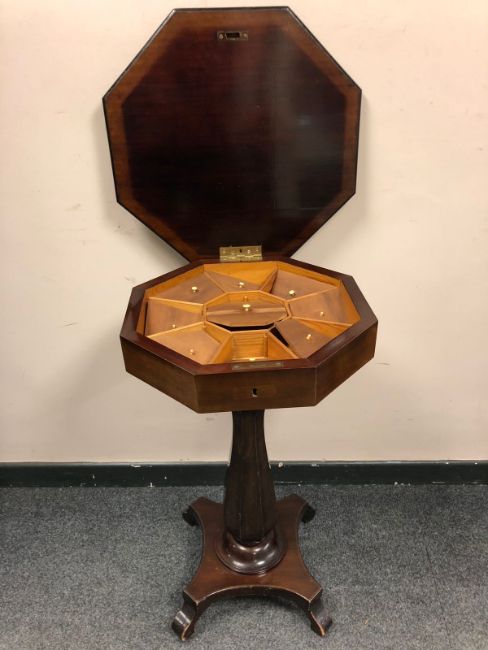 A 19th century octagonal mahogany work table, width 47cm
