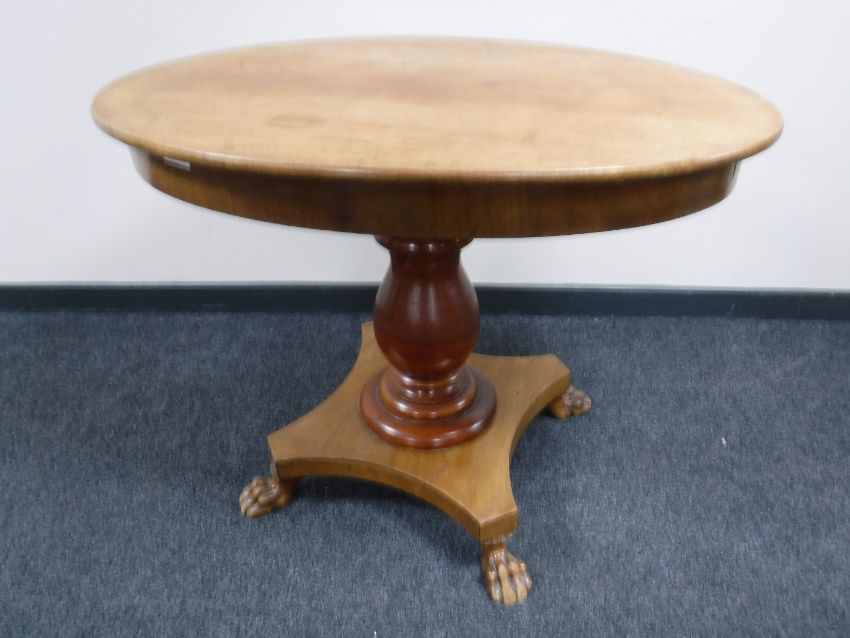 A 19th century mahogany oval pedestal table on paw feet