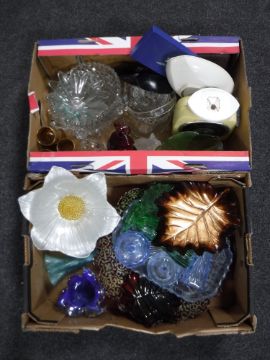 Two boxes of assorted glass ware including trinket sets, flower bowls, together with a set of kitchen scales