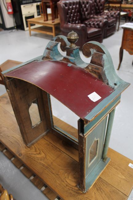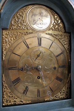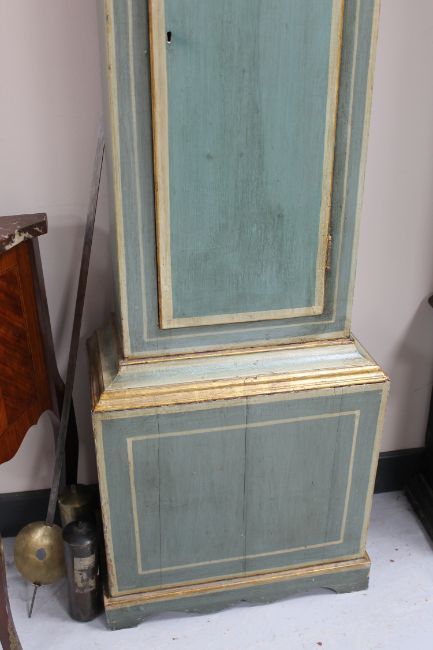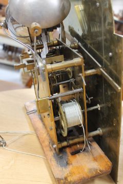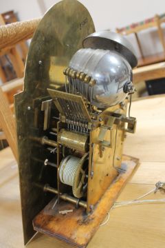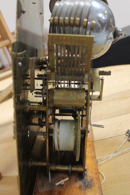 Hood lacks front glass. 12" dial. Movement and case likely associated. Movement is musical, striking on eight bells. With pendulum and two weights. Case door is jammed shut.