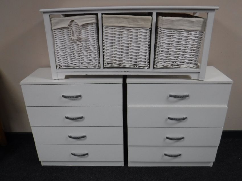A pair of white four drawer chests and a storage unit with wicker baskets