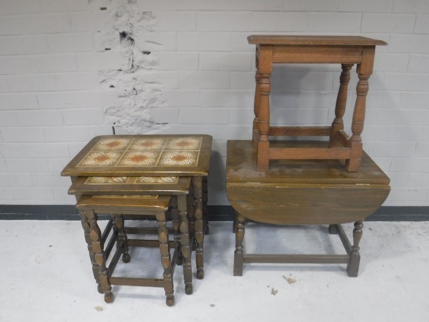 A nest of three oak tiled top tables, oak stool and a drop leaf table