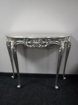 104cm wide by 38cm deep by 83cm high. One with prominent watermark to top. Both tables are otherwise in fair/good condition.