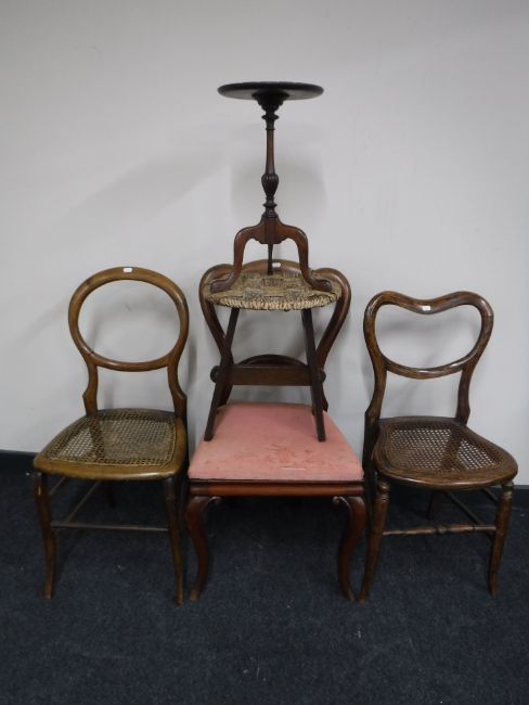 A Victorian dining chair, two bedroom chairs, oak stool and wine table