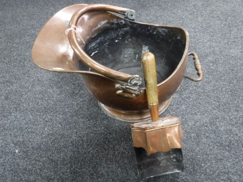 An antique copper coal helmet with shovel