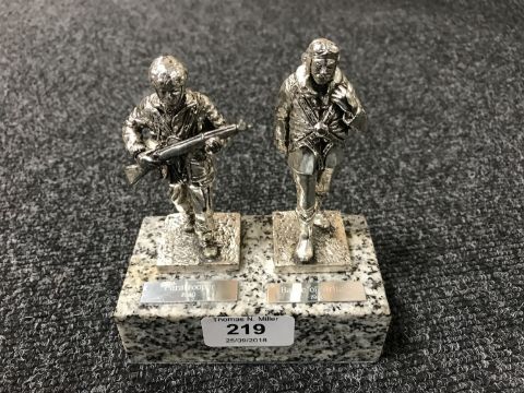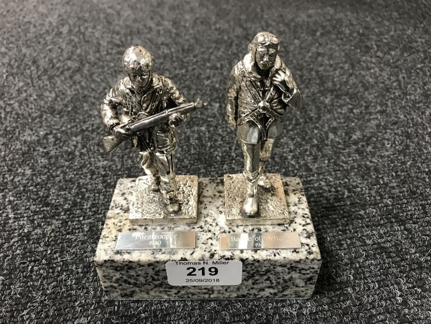 A pair of silver plated military figures on granite plinth, Paratrooper 1940 and Battle of Britain 1940, height 13cm