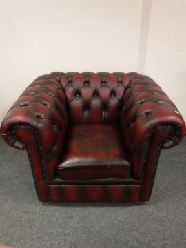 A three piece oxblood red leather Chesterfield suite comprising three seater settee, club armchair and wing back armchair. (3)