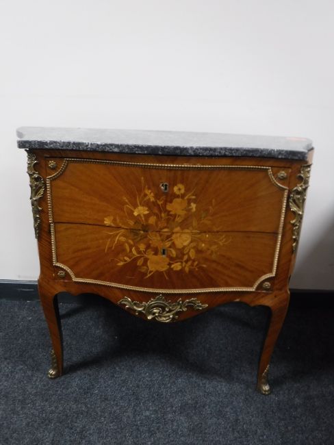 A French Kingwood and gilt metal mounted two drawer marble topped commode chest (marble a/f)