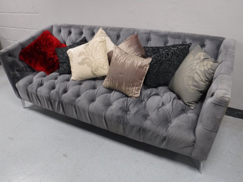 A contemporary three seater settee, upholstered in a button fabric, with eight miscellaneous scatter cushions