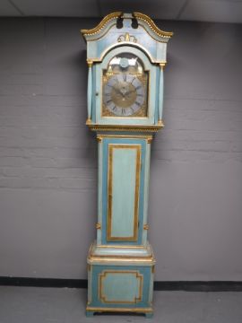 A continental painted and gilt longcase clock with pendulum and weights
