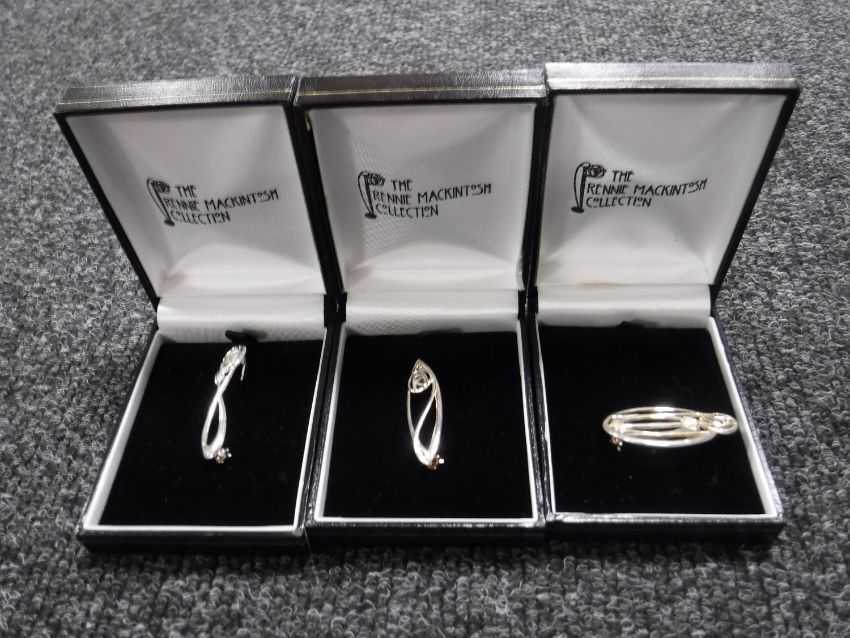 Three boxed sterling silver Rennie Mackintosh Collection brooches