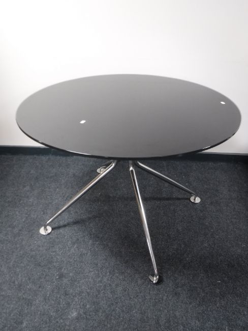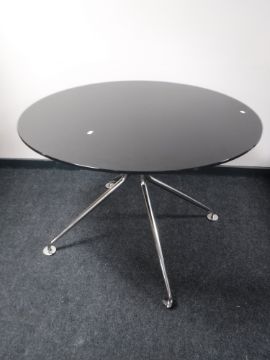 A set of six Italian Calligaris L'eau designer clear dining chairs on metal legs with a black glass Calligaris dining table on metal base