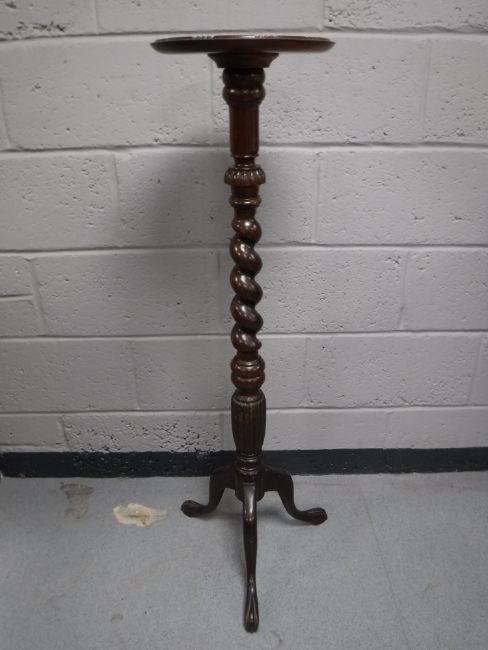 A mahogany barley twist plant stand on tripod base