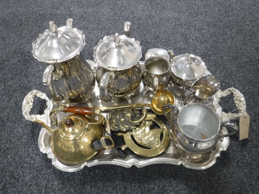 A plated twin handled serving tray, four piece plated tea service, further plated sugar bowl and milk jug and assorted brass ware