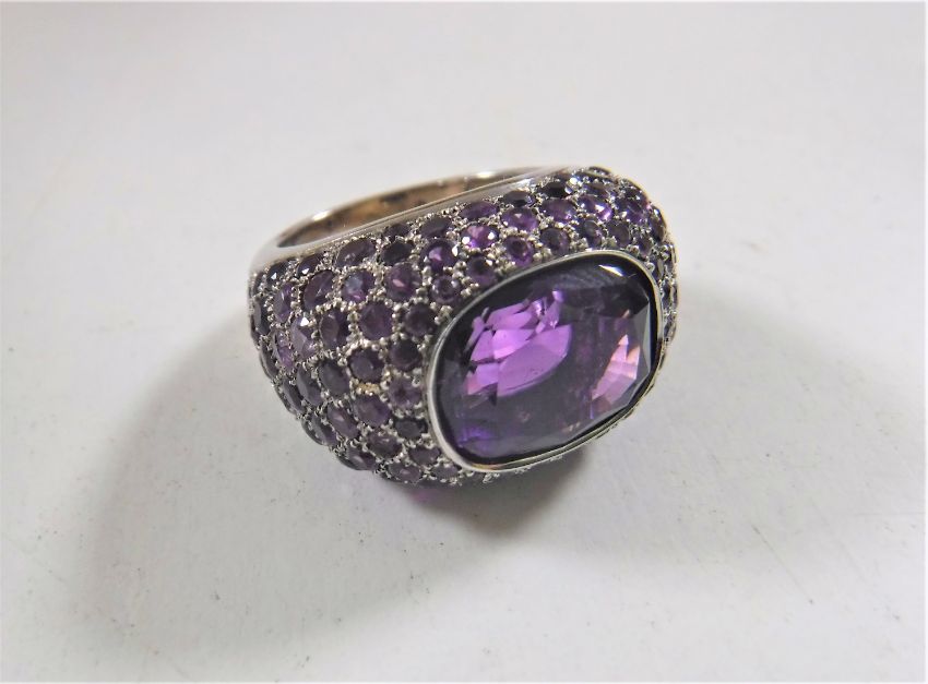 An 18ct white gold and amethyst cluster ring, 16.5g, size N
