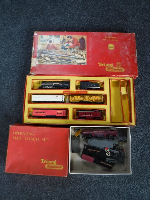 A vintage boxed Triang train set together with a box containing a Royal Mail coach and part buildings