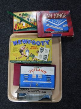 A tray containing a Subbuteo angling set, together with two Mahjong sets, Newfooty table soccer, Meccano building kit and The Game of the Battle of Jutland