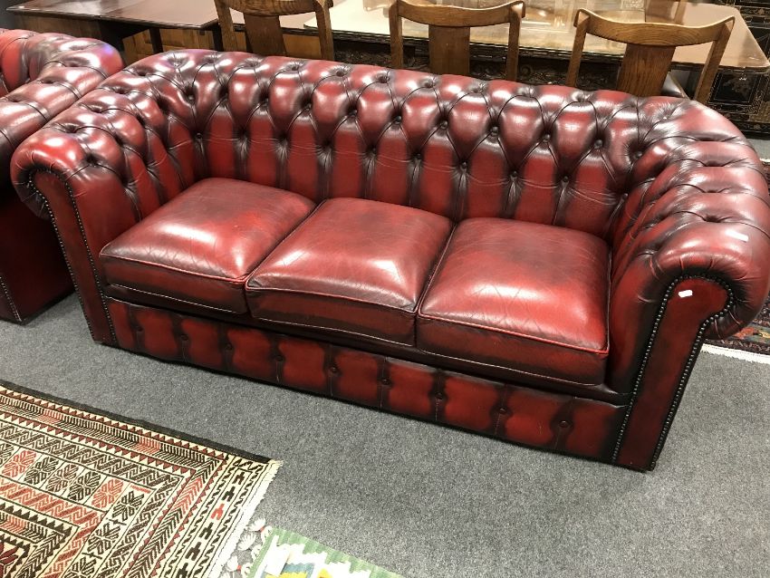 A Burgundy leather Chesterfield style buttoned three seater settee, width 188cm