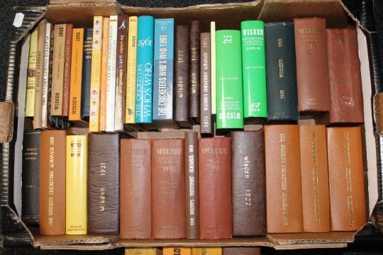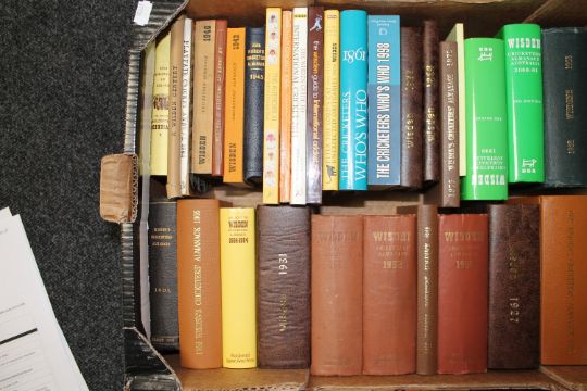 Six boxes of Wisden Cricket Almanacks dating from 1868 to present day including many reprints and other cricketing books