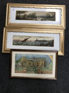 Two gilt framed oils depicting sailing boats and a framed watercolour, St Mary's at Dusk