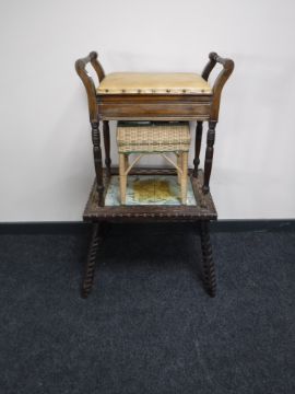 An Edwardian piano stool, coffee table depicting map of the world and a wicker sewing box