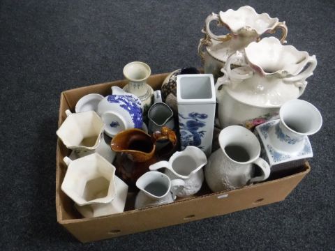 A box of assorted 20th century and later jugs and vases including oriental, Ringtons, Maling, willow pattern etc