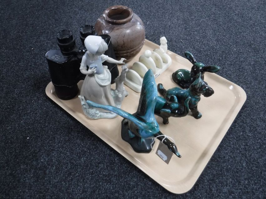 A tray containing a pair of Solother 7x50 field glasses, marble vase, Nao figure, Lurpak toast rack, etc