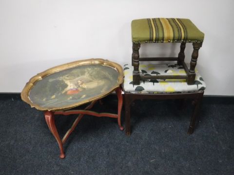 A hand painted gilt wood tray on stand together with two stools