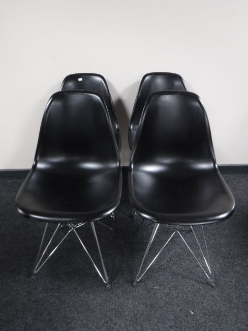A set of four black plastic dining chairs on metal legs
