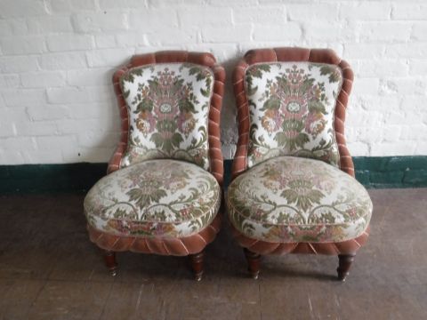 A pair of early twentieth century nursing chairs, upholstered in a floral brocade