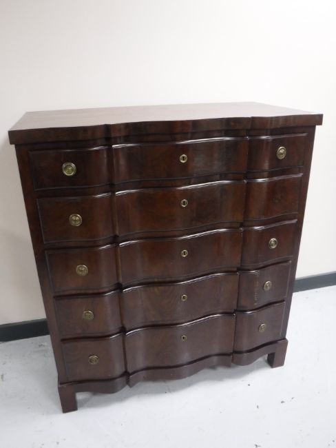 A continental mahogany serpentine fronted five drawer chest