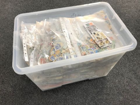 A plastic crate, containing a very large quantity of assorted loose stamps