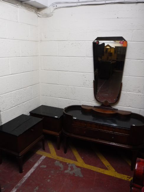 A twentieth century mahogany low dressing table, fitted four drawers together with a pair of matching bedside stands