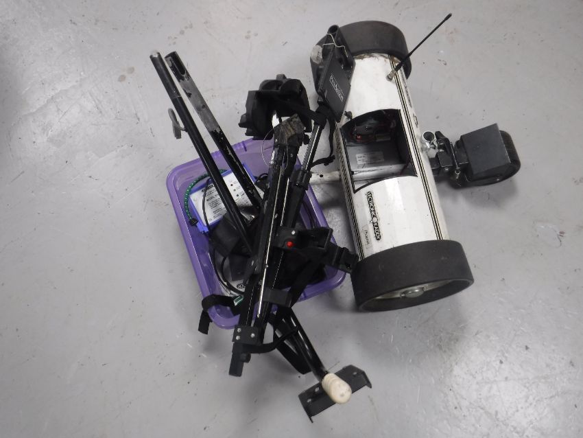 Six assorted golf bags containing clubs and drivers, folding golf trolley, electric golf trolley (no battery) with charger and two pairs of golf shoes