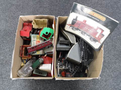 Two boxes containing Hornby Railways rolling stock, track and accessories