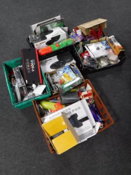 Six boxes of assorted electricals including two-way speakers, web cams, Sky Hawk R.C. helicopter, assorted novelties, gift bags etc