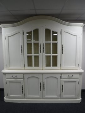 A painted arch topped four door display unit fitted with cupboards and drawers beneath