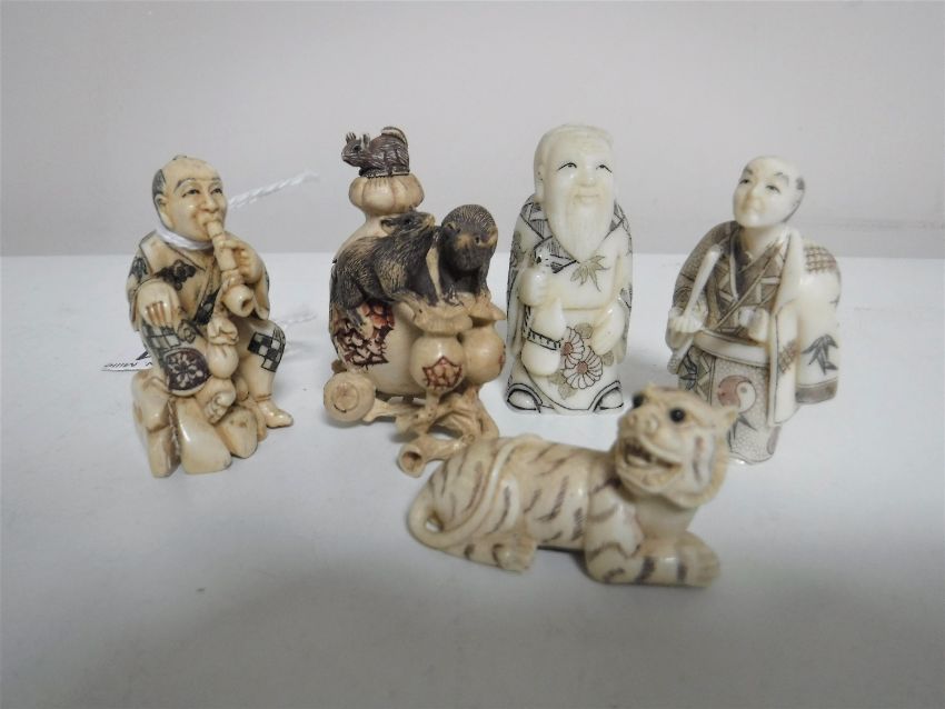 A Japanese ivory netsuke in the form a seated man smoking a pipe, together with three further ivory and bone netsukes and an okimono in the form of rats drinking from a tropical plant (5)