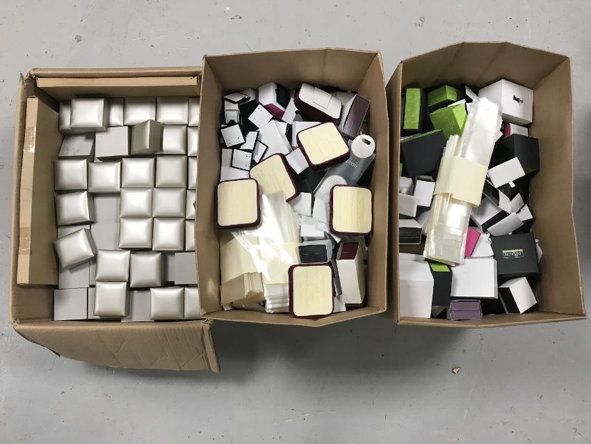 Three boxes of assorted jewellery boxes and display stands