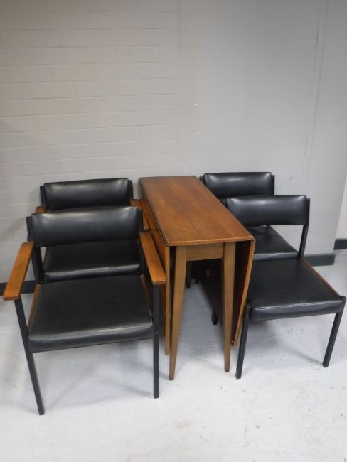 A mid twentieth century teak drop leaf table, together with a set of four black vinyl chairs (two carvers, two singles)