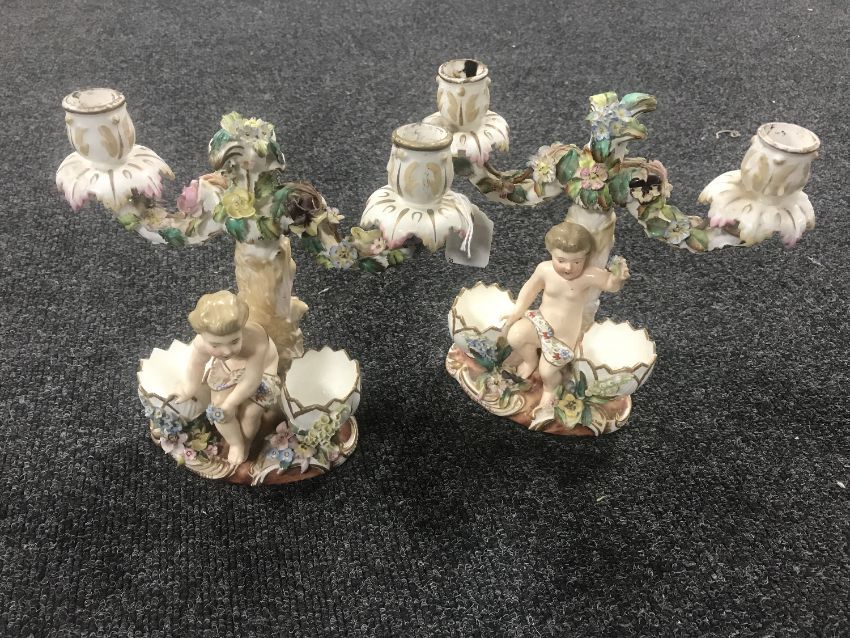 A pair of continental porcelain twin branch candelabrum decorated with putti