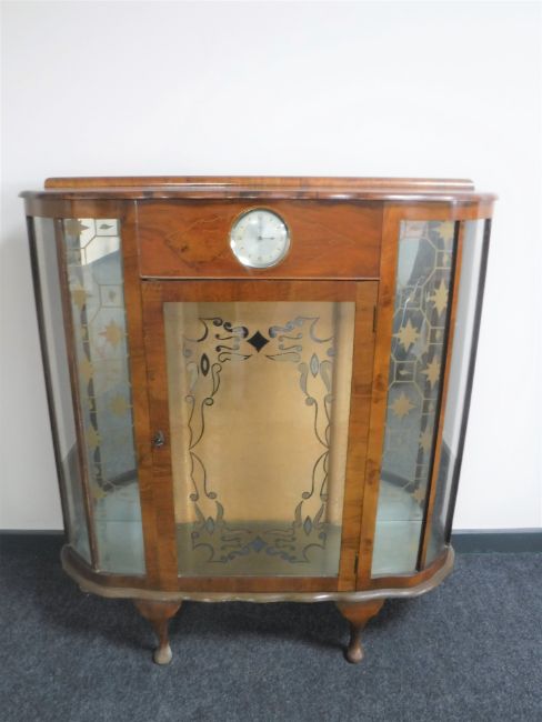 A twentieth century walnut display cabinet, fitted with a Smiths clock