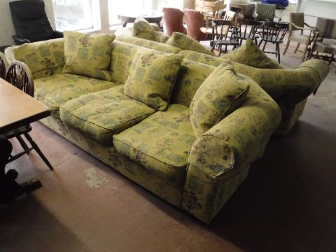 A pair of large three seater settees with loose cushions upholstered in a classical print